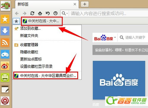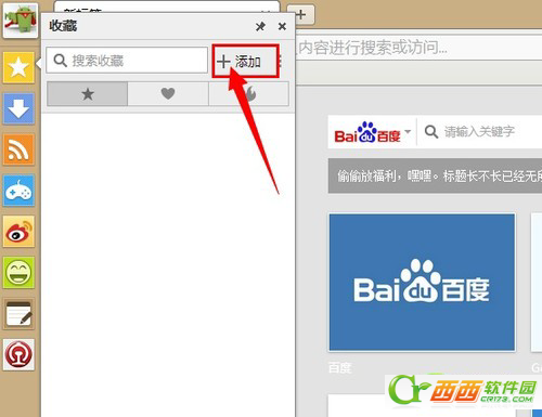 在一个站点正常打开的状态下,用户这时可以将网址网址收藏到收藏夹中,如上面的截图可见,收藏夹在傲游云浏览器的侧栏,以及网址栏的下方位置上都可以找到进入的通道。