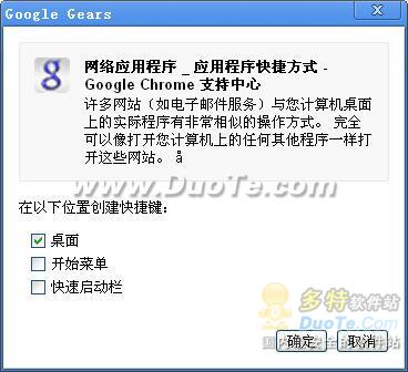 点击“网页”菜单,选择“创建应用程序快捷方式”。在”Google Gears”对话框中,选择要在放置快捷方式的位置的复选框。