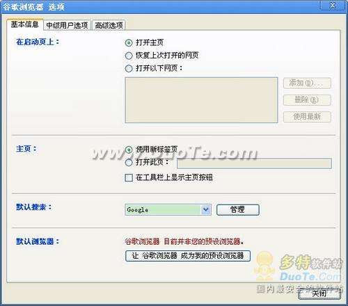 “基本信息”选项中可以设置启动页、主页、默认搜索和默认浏览器。
