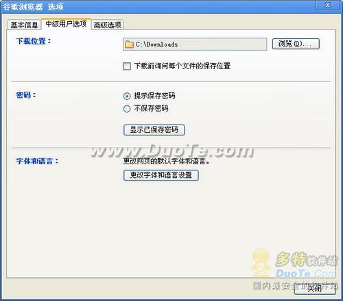 “中级用户选项”中可以设置下载位置、密码、字体和语言。