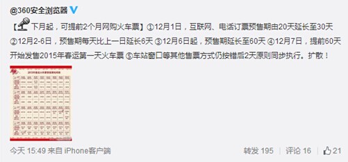 与此同时,作为亿万网民抢票必备的360浏览器官微同步发布,今年春节,使用360浏览器将可提前60天抢票回家,一起帮助铁道部共同缓解春节抢票难题,全力帮助广大网民能够安全、安心、顺心回家过节。据了解,截至目前,360浏览器已累计抢票近8000万张,是亿万网民公认抢票王。