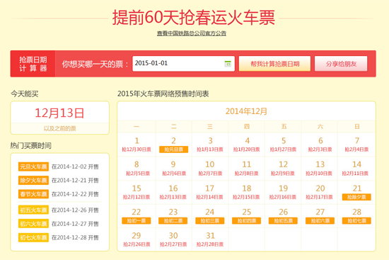 2014农历马年是闰年,共计384天,有2个九月,导致2015年的寒假非常的长,如果还是以前提前20天的火车票预售方案,相信很多学生们寒假都开始了,火车票都还没买到。为了方便大家顺利回家,近日,中国铁路总公司正式公布,今年12月6日,火车订票预售期延长至60天,即12月7日起,可提前60天开始发售2015年铁路春运第一天的火车票。
