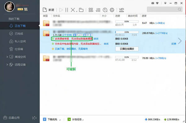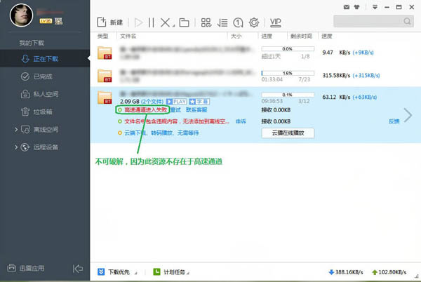 此时观察每个迅雷任务下行的高速通道提示,将可能出现:①高速通道进入失败;②资源被举报,无法添加到高速通道.