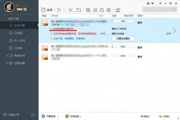 五、启动迅雷,发现任务下显示"高速通道服务暂停中",开始任务即可进入高速通道下载.