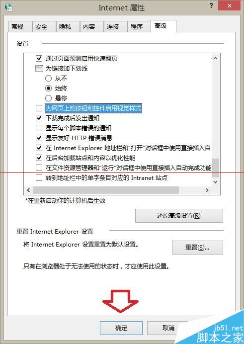 7、找到 为网页上的按钮和控件启用视觉式样 选项,并点击去除选中对勾。