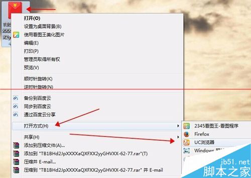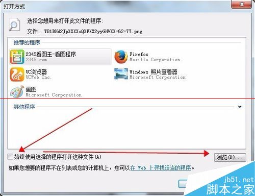 1、选择要采样的图片用浏览器打开,将鼠标箭头移到图片上右击选择打开方式选择浏览器,没有浏览器图标的先到默认程序进行设置。