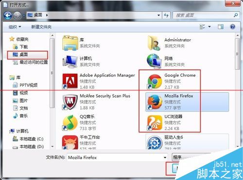 2、默认程序设置。不要勾选始终使用选择,点击浏览,在桌面选择浏览器点击打开。