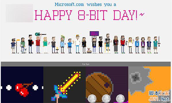 打开之后,就会看到微软在网页上方给出的“微软官网祝你8位节快乐”的字样,下面有各种8位人物形象以及经典8位游戏图标。点击之后会打开必应给出对应搜索信息。