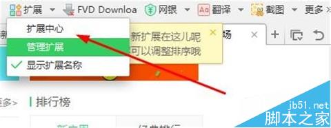 2、添加的办法是在右上角找到“拓展”,点击下拉箭头,点击“管理拓展”,拓展管理下面找到“FVD Download”。然后点击一下图标,确定安装拓展。安装后,拓展图标会出现在右上角。