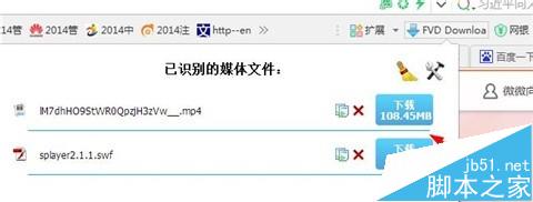 4、此时点击一下FVD Download图标,会自动为你识别本页的视频,有后缀为.mp4和.swf的文件,选择MP4文件的格式,点击后面的下载,可以删除不需要下载的其他文件。