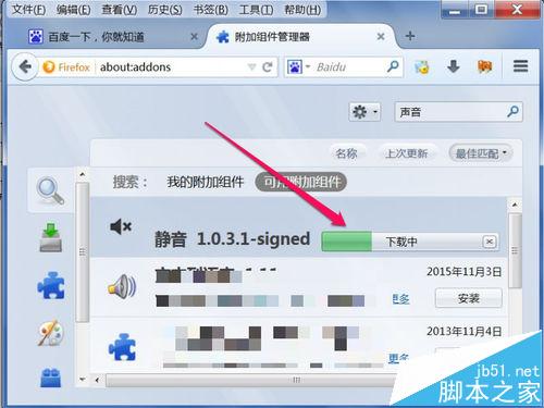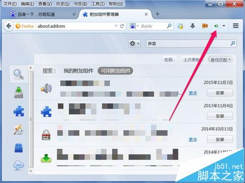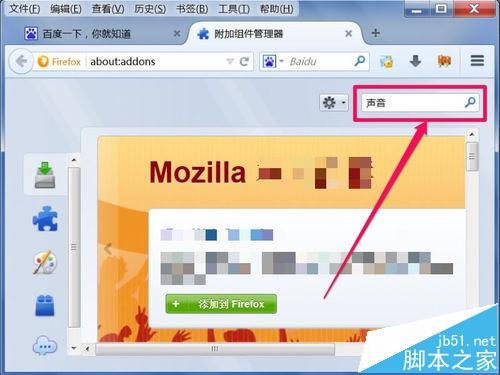 3、进入附加组件管理器窗口,在搜索框中,输入“声音”二字,然后点搜索图标。