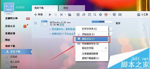 1、如图,我们在【正在下载】的任务中把任务删除掉,删除之后我们怎么恢复下载呢?