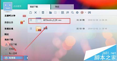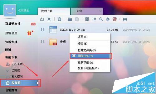 2、如果当时你选择的是删除,而不是彻底删除,那么我们在左侧找到【垃圾箱】,在垃圾箱里面就会有刚才删除的任务,点击它就可以继续下载
