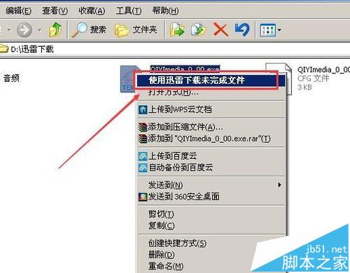 4、找到刚才那个任务文件,然后我们选中它,点击鼠标右键,选择使用迅雷下载未完成文件。如果不知道怎么找迅雷下载的文件,你可以在电脑中搜索“迅雷下载”