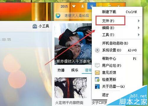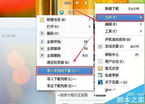 8、你还可以通过导入的方式来恢复下载任务,我们打开迅雷,点击倒三角符号,然后选择【文件】