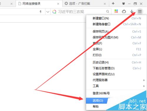 1、通过设置将360浏览器的广告屏蔽关掉。点击浏览器右上角的菜单,找到“选项”