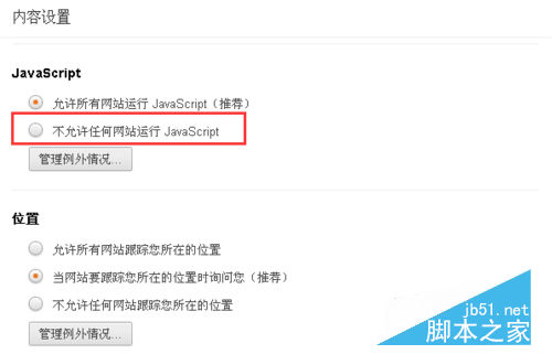 5.在内容设置界面,我们可以看到是否允许网站运行JS,默认是允许运行,选择不允许运行JS。