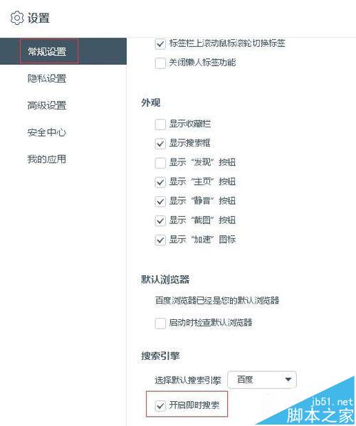 3、进入设置页面后,选择“常规设置”后。在右边页面里,把“搜索引擎”项目下的“开启即时搜索”选项取消勾选,就可以关掉咯(*^__^*)