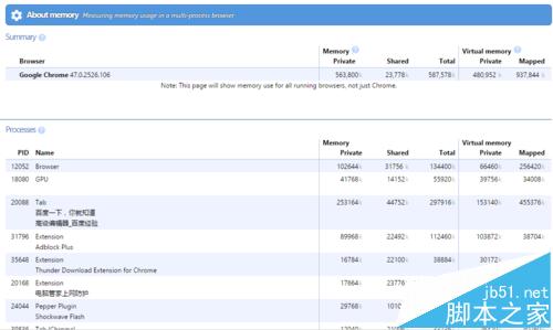 3、在打开的Chrome的任务管理器窗口中,我们可以查看到各个组件(例如,浏览器主进程、插件、扩展程序等)分别占用多少内存。