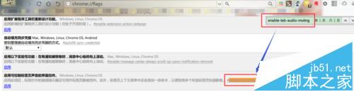 3、按下Ctrl和F组合键,弹出页面搜索框,输入enable-tab-audio-muting,浏览器会自动帮你定位到该功能的选项位置。