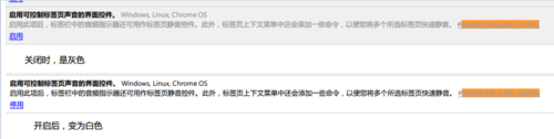 4、点击启用蓝色开关,开启“启用可控制标签页声音的界面控件”,该功能条由灰色变为白色