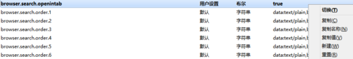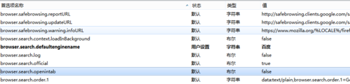3、单击后,就进入了设置页面,里面很多项目,按照英文字母的顺序找到“browser.search.openintab”,如图所示: