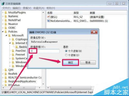 4、然后以HKEY_LOCAL_MACHINE根键为头,依次打开[HKEY_LOCAL_MACHINE\SOFTWARE\Policies\Microsoft\Internet Explorer\Restrictions]此注册路径。到右侧,找到“NoExtensionManagement”,双击。