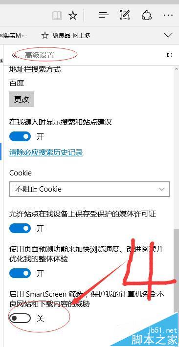 3、在高级设置里面 选择”启用SmartScreen筛选器“,右拉选择关闭