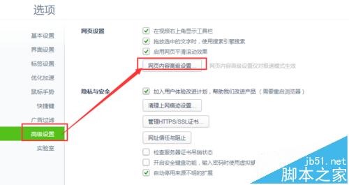 3、高级设置→网页内容高级设置。