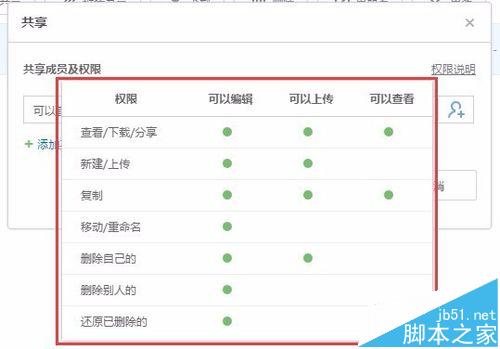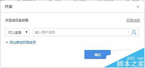 2)在弹框中,设置共享成员及权限,权限分为可查看,可上传,可编辑。