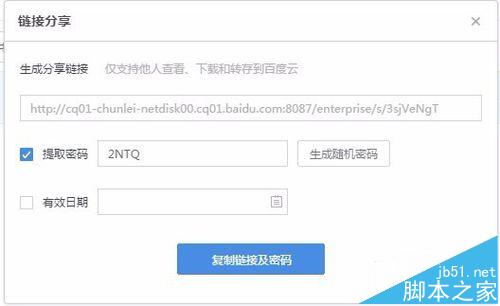 2)在链接分享弹框中,设置提取密码及有效期,密码支持手动填写。点击复制链接及密码,即可复制外链地址及密码,粘贴发送给指定客户。
