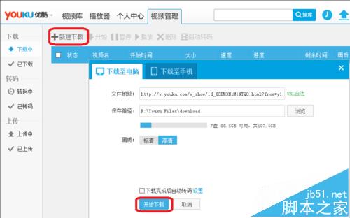2、打开优酷客户端——视频管理——点击新建下载。然后下载。如果你网速不行的话,也可以使用这种方法。
