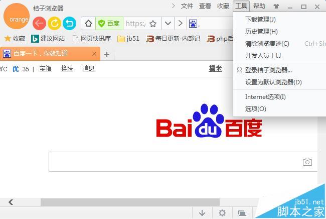 1、打开桔子浏览器并登录帐号,点击点击右上角的工具菜单