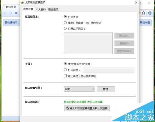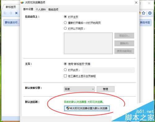 5、在“太阳花浏览器选项”对话框中,找到“默认浏览器”下的“将太阳花浏览器设置为默认浏览器”按钮并点击它即可。如图所示;