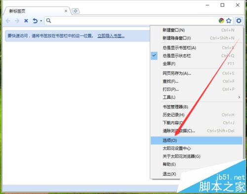 4、点击“选项”命令选项后,这个时候会弹出浏览器“太阳花浏览器选项”对话框。如图所示;