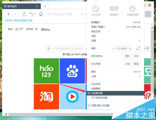 3、在弹出的菜单选项中,点击“浏览器设置”命令选项。如图所示;
