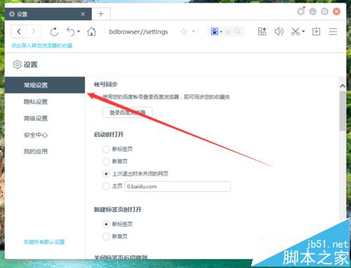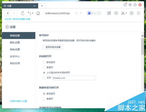 4、点击“浏览器设置”命令选项后,这个时候会弹出浏览器“设置”对话窗口。如图所示;