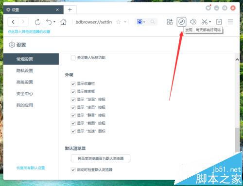 6、在“常规设置”选项卡中,找到“外观”下的“显示‘发现’按钮”选项,并将其勾选即可。如图所示;