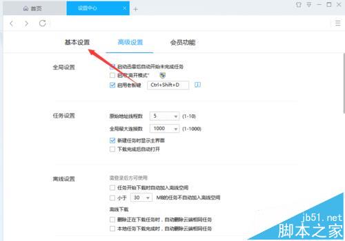 4、打开设置中心后,点击“基本设置”。高级设置没有默认下载地址设置。