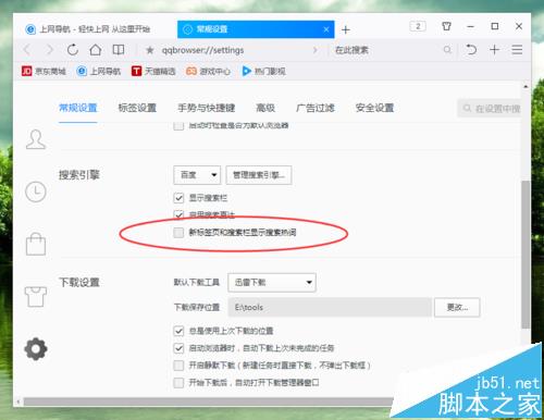 6、在“常规设置”选项卡中,找到“搜索引擎”下的“新标签页和搜索栏显示搜索热词”选项,并将其取消勾选即可。如图所示;