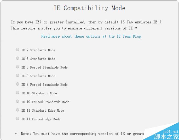 拉到页面最底部,勾选所要模拟的IE版本,它可以从最高IE 11一直模拟到IE 7,一般情况下,推荐选择IE X Standards Mode就够了。