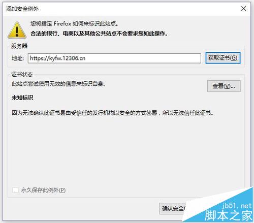 4、在“添加安全例外”对话框中,输入你要添加例外的服务器地址,点击“获取证书(G)”。如图所示