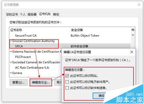 5、如果你上一步的勾选需要修改,可以找到该证书名称(12306直接就是SRCA),点击“编辑信任(E)...”按钮即可。如图所示