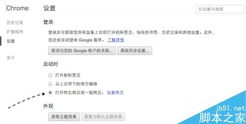 接着再点击【设置网页】选项,设定自己想在打开 Chrome 浏览器时所打开的页面地址。