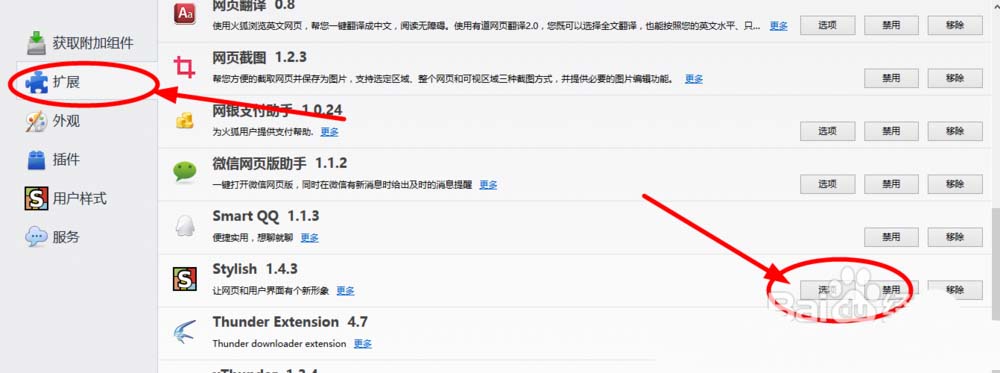 4、这时我们回到下图所示的地方,点击扩展,找到Stylish,点击选项。进去之后点击管理样式