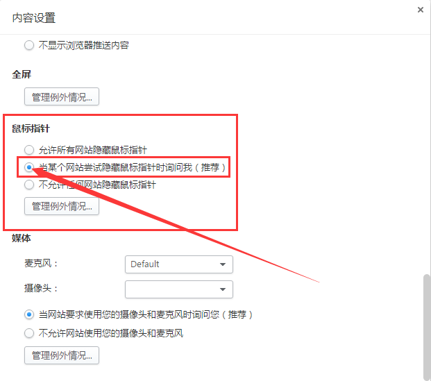 6、跳出内容设置界面往下拉找到【鼠标指针】中的【当某个网站尝试隐藏鼠标指针时询问我】前面打上点,最后点击【完成】就好了。