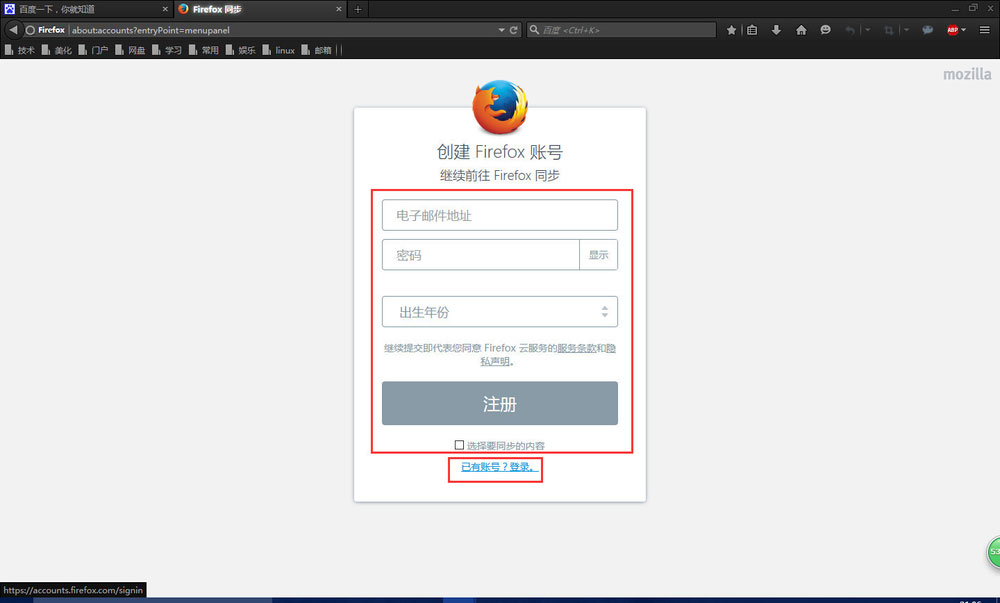 5、如果你之前没有火狐的账号,那么在这里可以注册一下,此处选择下面的”已有帐号?登录“,如图所示