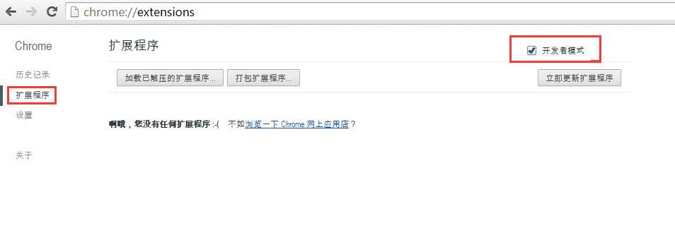 3、在弹出新页面中,如下图所示,选择扩展功能,并勾选开发者模式。