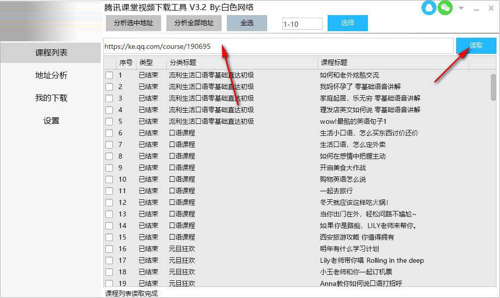 4、粘贴地址以后点击读取,下方显示课程的全部内容