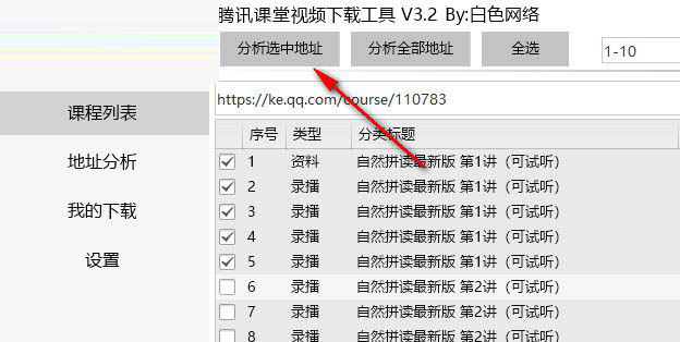 6、勾选以后点击分析选择的地址,随后软件自动分析课程地址